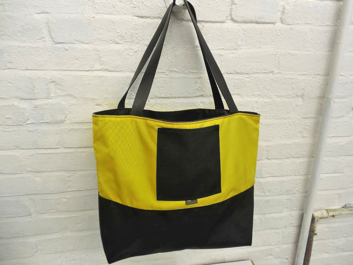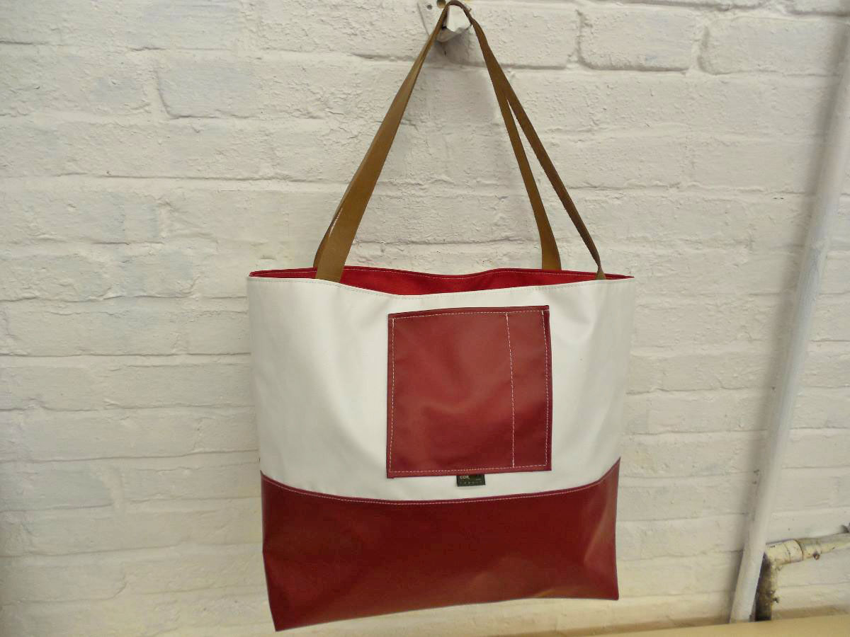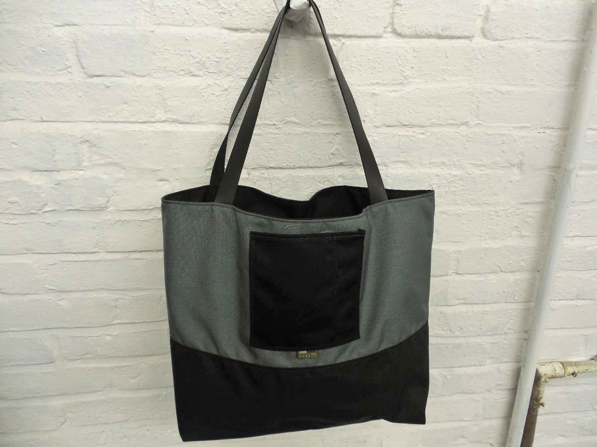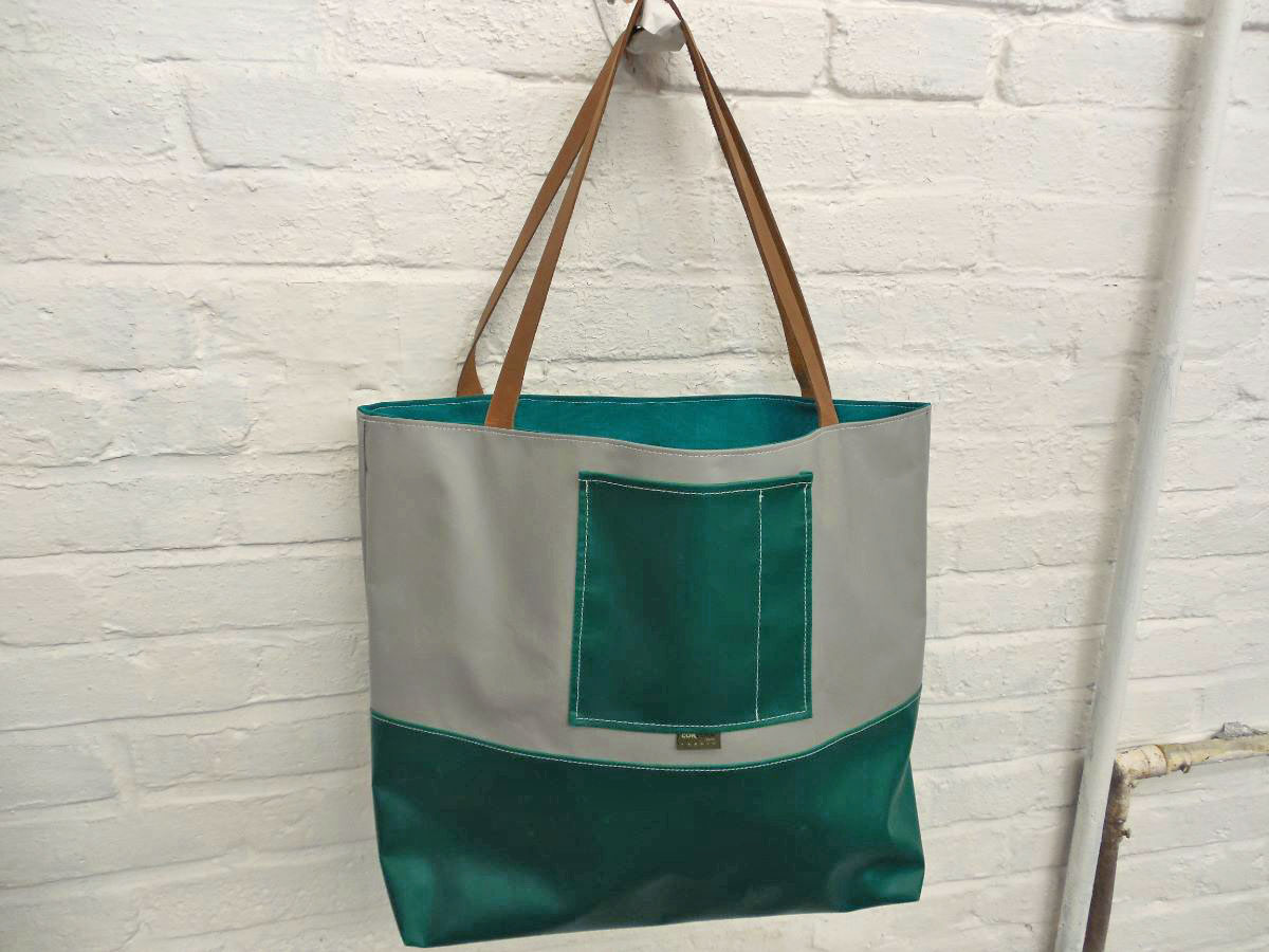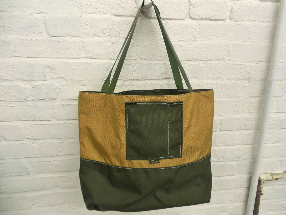 A larger tote than The Weekender, this is our 2-piece design tote, made from reclaimed and recycled heavy duty Cordura© Nylon and/or 18 oz Vinyl or 22 oz Marine Vinyl. Leather, Seatbelt, or Cordura style strap, with Cordura or Sunbrella© liner. Durable, long-lasting, and immaculately crafted. This is a stylish tote bag, ideal for shopping or general purpose use.
