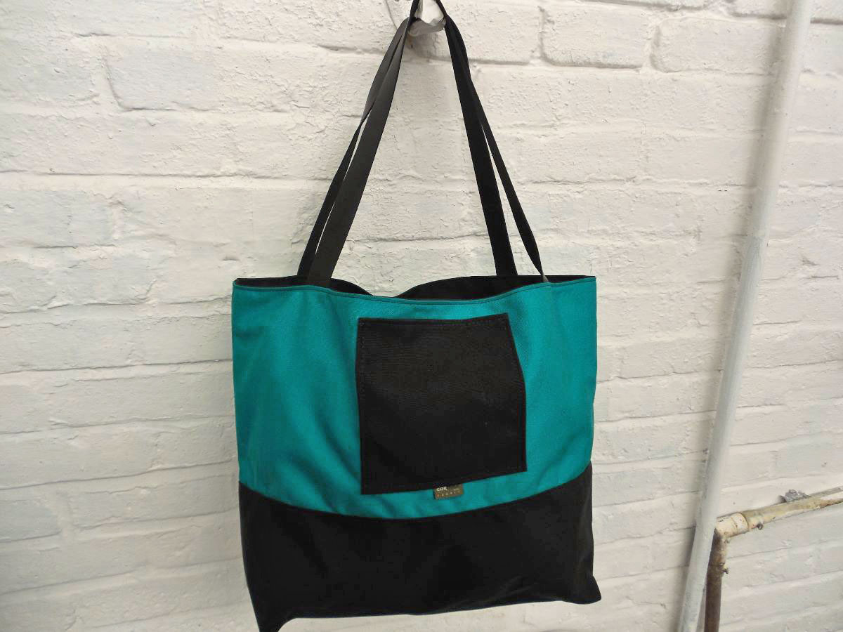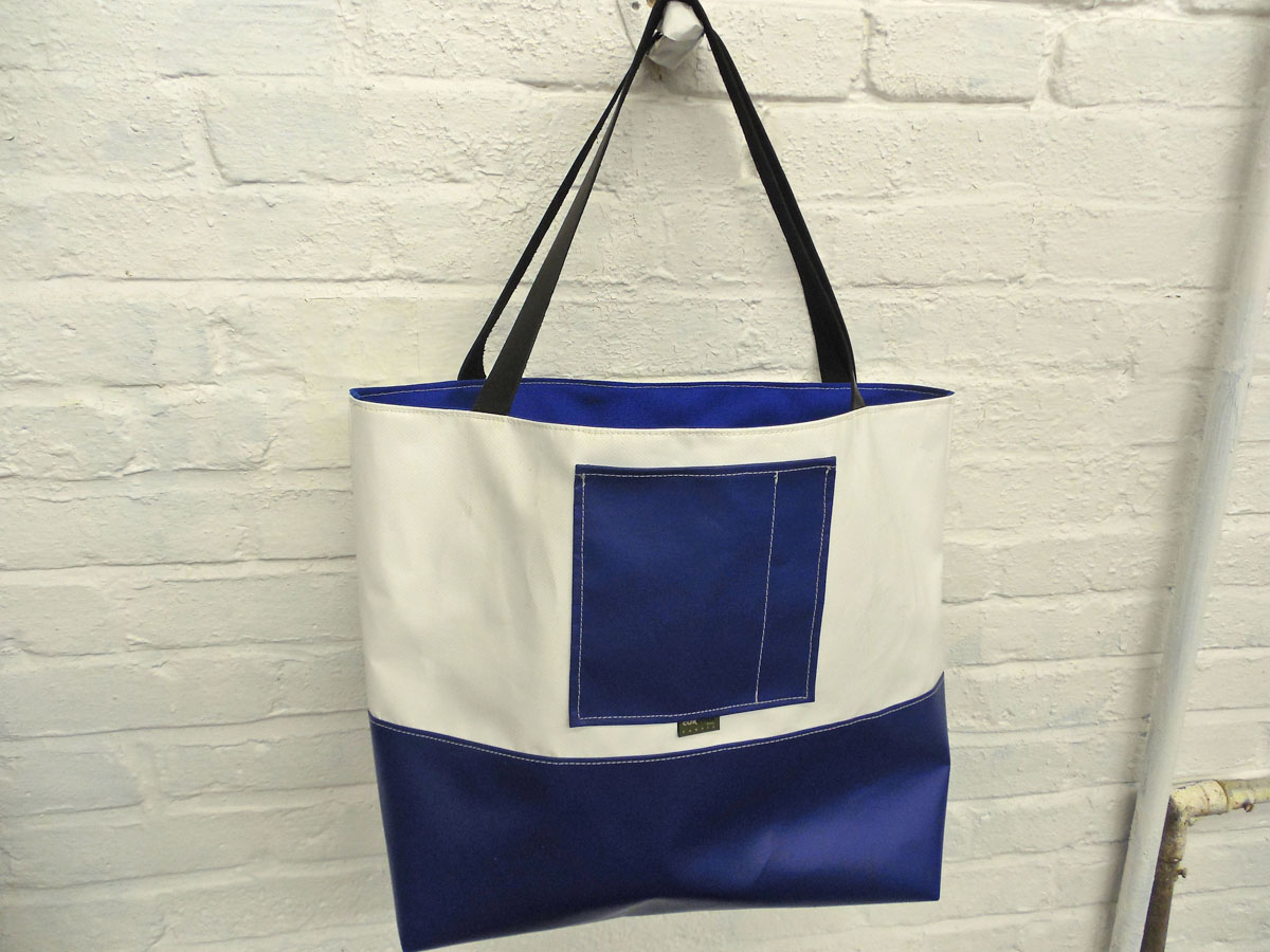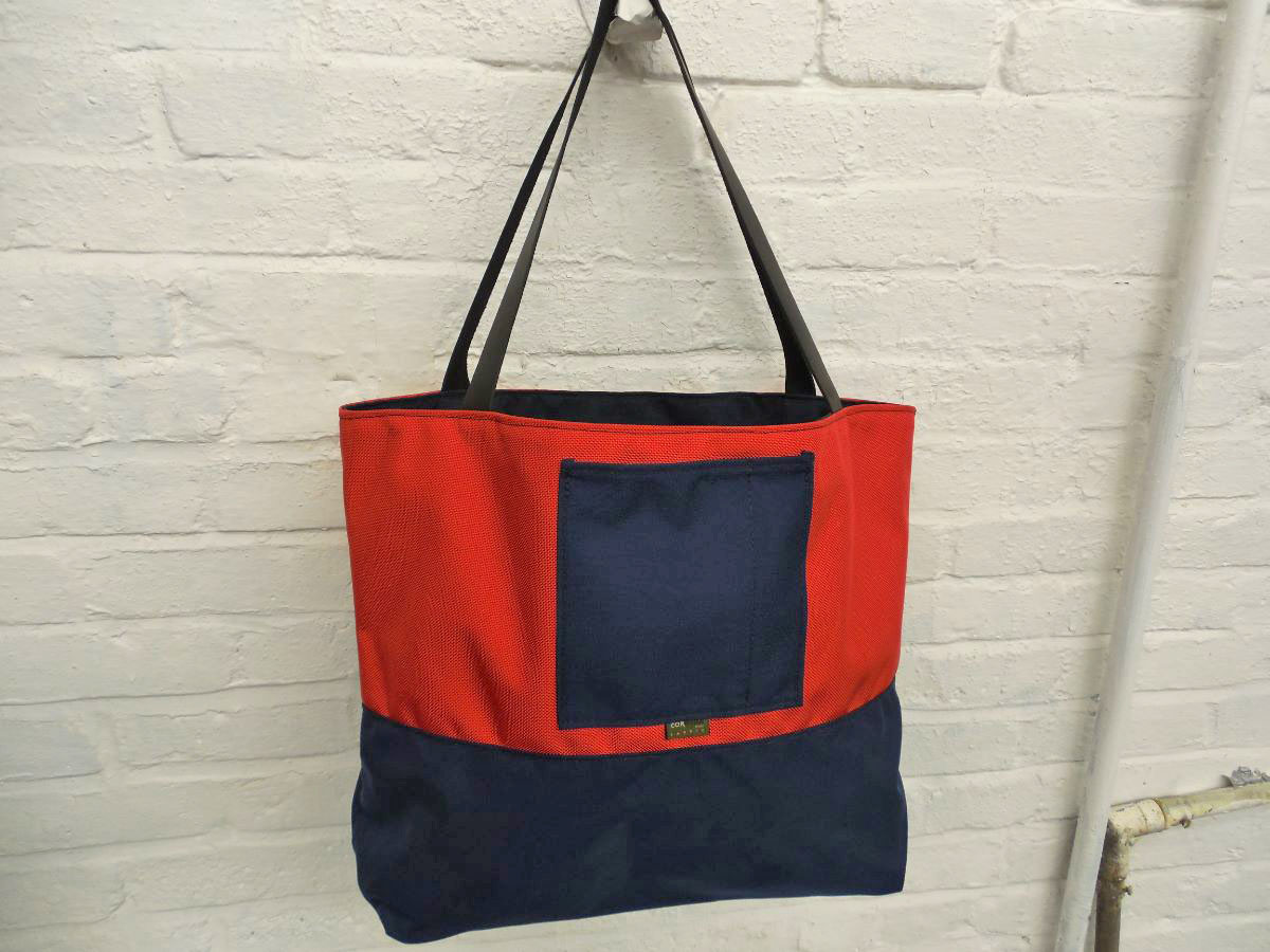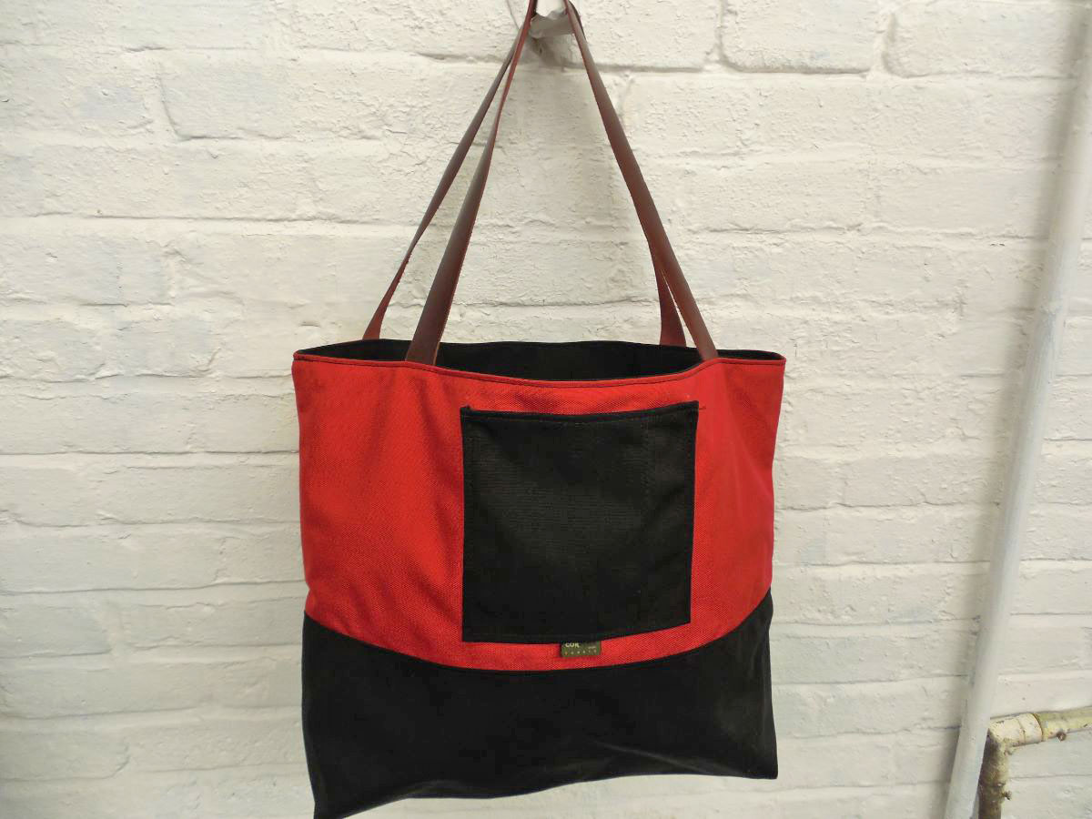 A larger tote than The Weekender, this is our 2-piece design tote, made from reclaimed and recycled heavy duty Cordura© Nylon and/or 18 oz Vinyl or 22 oz Marine Vinyl. Leather, Seatbelt, or Cordura style strap, with Cordura or Sunbrella© liner. Durable, long-lasting, and immaculately crafted. This is a stylish tote bag, ideal for shopping or general purpose use.